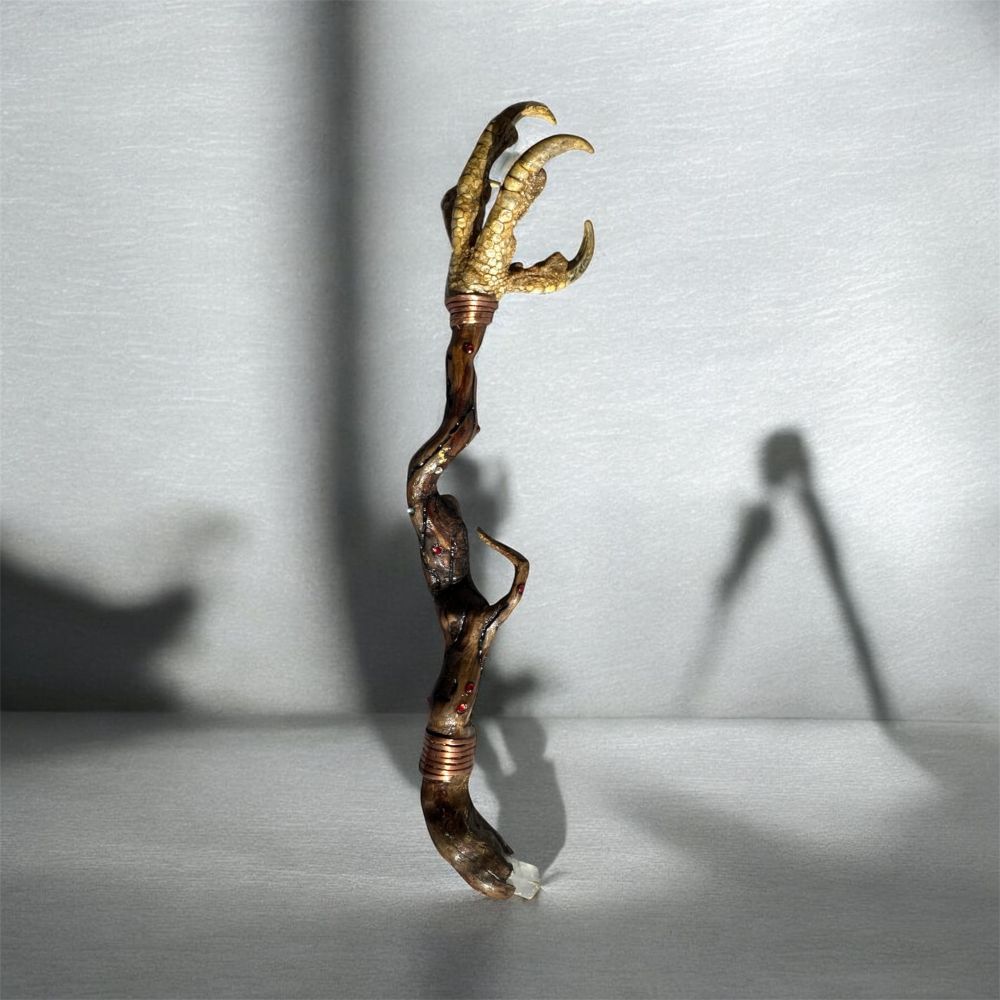Horoz pençesi, kuvars kristali, bakır tel kullanılmıştır. Gövde de yakma işleme ve bocuk süsleme yapılmıştır.